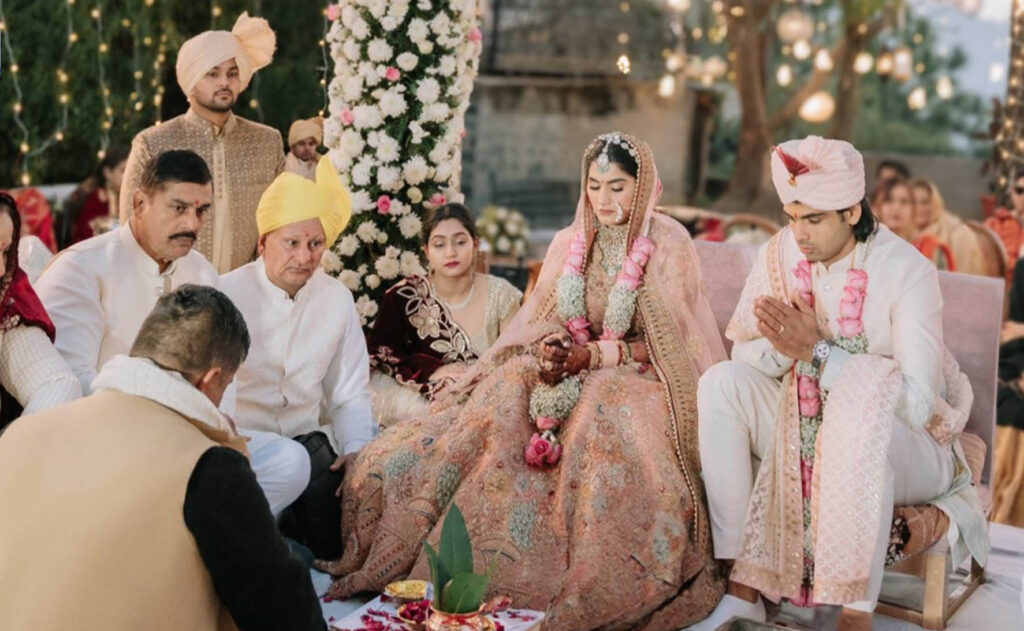 नई दिल्ली, ओलंपिक स्वर्ण और रजत पदक विजेता भाला फेंक खिलाड़ी नीरज चोपड़ा शादी के बंधन में बंध गये हैं। नीरज की शादी एक पारिवारिक समारोह में सोनीपत की हिमानी मोर से हुई है इसमें परिवार और रिश्तेदारों के अलावा करीबी लोग ही शामिल हुए। नीरज ने सोशल मीडिया के जरिये आपनी शादी की तस्वीरें साझा की है। नीरज ने विवाह समारोह की तस्वीरों के साथ लिखा, ‘मैंने अपने परिवार के साथ अपने जीवन का एक नया अध्याय शुरू किया है। साथ ही लिखा है कि हर उस आशीर्वाद के लिए आभारी हूं जिसने हमें इस पल तक पहुंचाया। प्यार से बंधे, हमेशा खुश रहें। नीरज के विवाह को लेकर चाचा भीम ने बताया कि विवाह देश में ही हुआ और यह जोड़ा हनीमून के लिए विदेश रवाना हो गया है। हिमानी अभी अमेरिका में पढ़ाई कर रही हैं। भीम ने कहा, ‘हां, विवाह दो दिन पहले भारत में हुआ। मैं यह नहीं बता सकता कि यह कहां हुआ। लड़की सोनीपत की है और वह अमेरिका में पढ़ाई कर रही है। वे हनीमून के लिए देश से बाहर गए हैं और मुझे नहीं पता कि वे कहां जा रहे हैं। हम निजता बनाये रखना चाहते थे। टोक्यो ओलंपिक में स्वर्ण और पेरिस खेलों में रजत पदक जीतने वाले नीरज इससे पहले दक्षिण अफ्रीका में ट्रेनिंग ले रहे थे। नीरज ने टोक्यो ओलंपिक में स्वर्ण जबकि पेरिस ओलंपिक में रजत पदक जीता था।